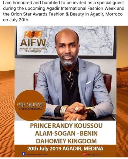 AGADIR MEDINA MOROCO, el día 20 de julio del 2019 el príncipe Brandy Koussou entregará la distinción creada por la diseñadora Iris Rodríguez.